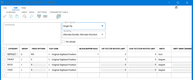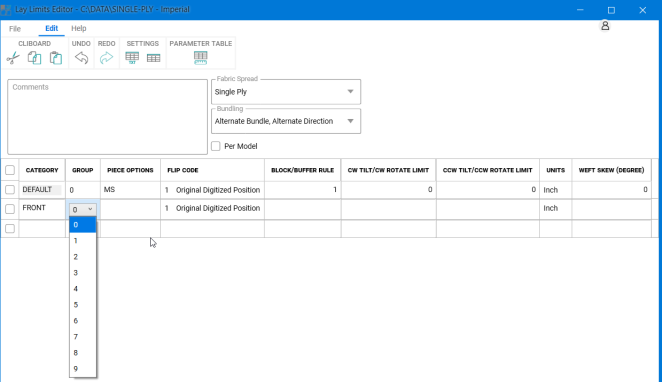 A new column has been added to the Lay Limits to allow pieces to be grouped together to ensure quality when sending the Markers to AccuNest for placement. This new group feature will allow designated pieces in a bundle that sew together to be flipped/rotated as a unit to ensure they match up in grain and shading.